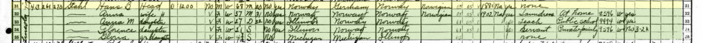 Hans Bernard Stahl (May 8, 1861-October 11, 1931) and Anna Larson Wollen Stahl (April 12, 1872-February 27, 1956) lived in Alpena, Michigan during the 1930 census. As the male, Hans is designated as the “head” of he household. Anna is listed below him and designated as “Wife H”, meaning the head’s (Hans’) wife. Below, two of their grown daughters, Anne M and Florence, as well as granddaughter Gloria, are listed. Moving from left to right, the next group of information indicates that the house they are in is worth $1200, and it is not a farm. Sex and race are followed by age, marital status (married, married, divorced, single, and single), age of marriage, school enrollment, father’s birth place, mother’s birthplace, language spoken, immigration year, naturalization status, if they speak English, occupation, industry, and veteran status.