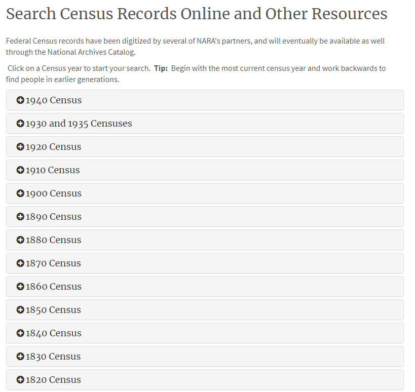 For our purposes, click on the option “Search Censuses by Year and Ancestor’s Name.” Here, a page will appear listing the census years back until 1790.